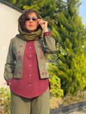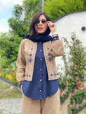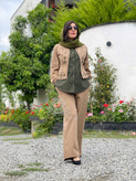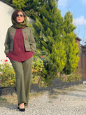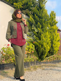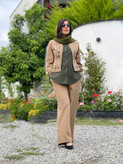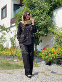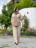 سه تیکه دارای جلیقه دکمه دار کاملا پوشیده وکت گلدوزی شده و شلوار کمر کش