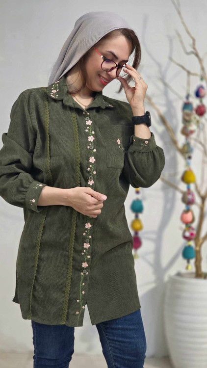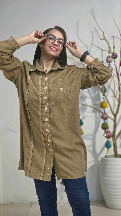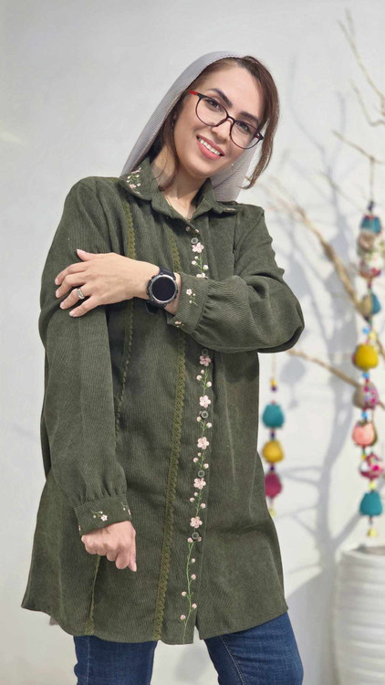 گلدوزی در سراستین و یقه و جلو مانتو و روی جیب